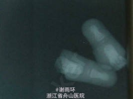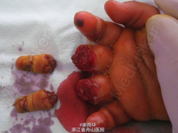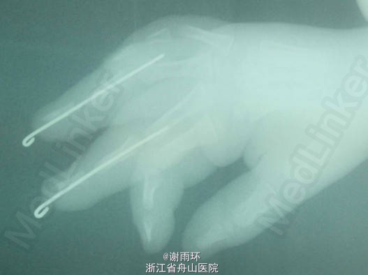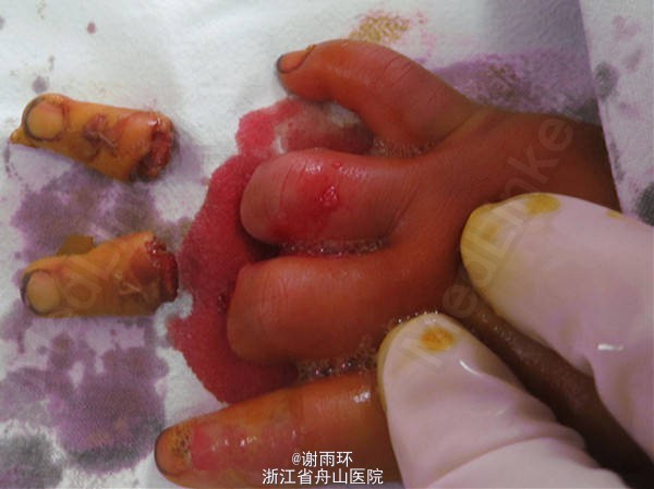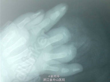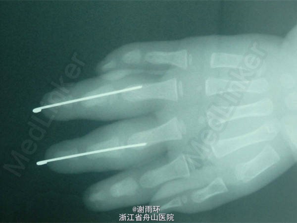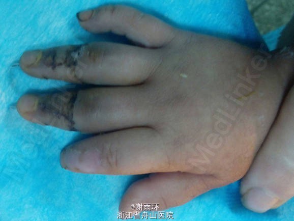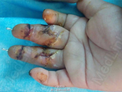 患儿2岁,三角带夹伤致右手中、环指中节基底以远离断。