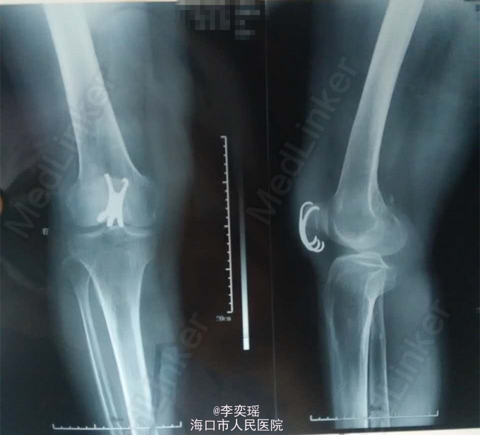 专科体查:右膝部中度肿胀,局部皮肤青紫,无皮肤破损。压痛,可扪及明显骨擦感及闻及明显骨擦音。右膝关节活动受限,浮髌试验(+),肢端感觉,血运好,趾活动好。左下肢,双上肢,脊柱活动好,无畸形。 辅助检查:右膝关节正侧位:右髌骨骨折