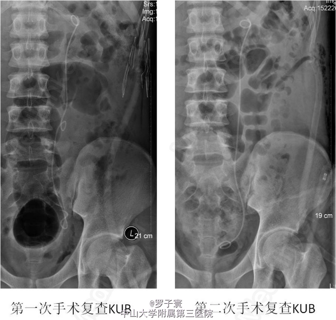 入院后予复达欣抗感染治疗一周,患者感染控制良好。于2013-10-12日在全麻下行“腹腔镜下左侧肾盂输尿管成形术”。术中于输尿管切开处置入COOK 4.7F双J管一条,术后复查腹部平片提示:双J管于输尿管下段迂折,未抵达膀胱(图2)。于2013-10-15在腰硬联合麻醉下行“输尿管球囊扩张+逆行置管术”,术中发现输尿管口较正常成人较小,用9F输尿管镜进镜困难,更换小儿4.5F输尿管镜顺利进入,发现输尿管下段在壁内段以上的管腔仍很狭窄,内径约3mm,长度约2.5-3cm,双J管于狭窄最高处迂折,迂折处内径大约5-6mm,于4.5F输尿管镜直视下将留置超滑导丝,逆行将8mmX15cm输尿管球囊扩张器跨过狭窄段,将球囊扩张器水压升至25afm,维持10min,待扩张后直视下逆行放置双J管,术后复查平片双J管位置正常(图2)。术后予心电监护、吸氧、抑酸、抗感染、营养支持治疗。术后恢复良好,予以出院。出院诊断:1.左侧肾盂输尿管连接处梗阻并左肾积液2.左侧输尿管下段狭窄。