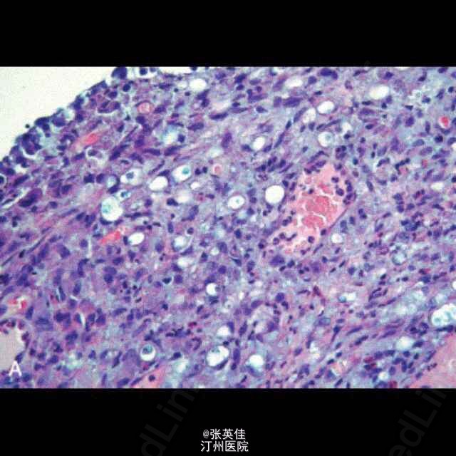 体检发现腹水 腹部超声提示肝周、脾周和盆腔有液性回声区域 妇科检查提示有一个1cm的宫颈息肉,活检提示该病灶为宫颈处息肉,基质中有一些结节状区域被印戒细胞侵袭 内镜提示有一个大的坚硬的溃疡型的肿块在幽门区域,活检提示为印戒细胞癌 腹部CT提示有增厚的胃壁和增大的淋巴结,网膜、肠系膜和腹膜上也发现多个结节,认为是癌的转移灶