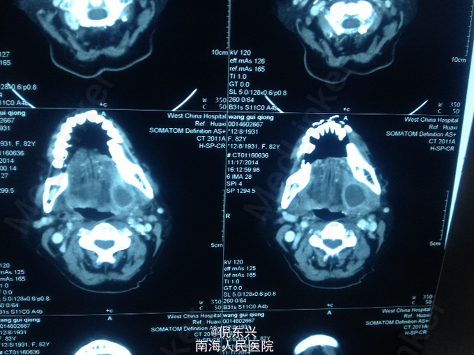 检查见:左侧颌下腺分泌功能下降,左侧颌下区有压痛,口内可触及一硬物 CT检查可见左侧可见一0.5*0.5cm大小的高密度影