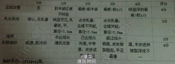 查体:脐部可见一约7cm*8cm组织物膨出。余未见明显异常。胎龄评分如图所示。 辅查: 血常规:WBC 17.79G/L,N 77.7%,HB 186G/L,PLT241G/L; 凝血功能:PT15. 7s,APTT58.2s,Fg 1.85g/L,DDI 4.62ne/L; 心脏彩超: 房间隔小缺损 (左向右分流) 余结果均阴性。