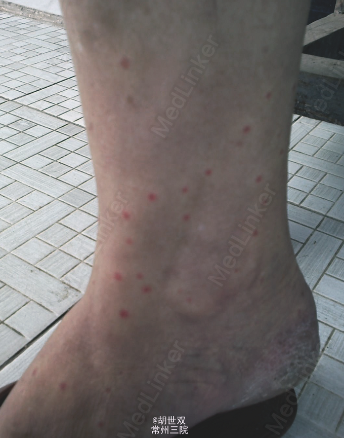 女,42岁,头痛伴双下肢乏力十余日,患者半月前受凉后发热,体温最高38.6 °C,伴有咳嗽咳痰,10日前出现头痛伴双下肢无力,无头晕、恶心、呕吐。当地医院予抗感染治疗未见明显好转。 3日前下肢出现散在瘀点瘀斑。