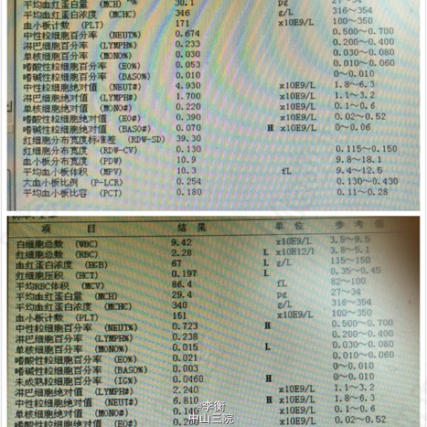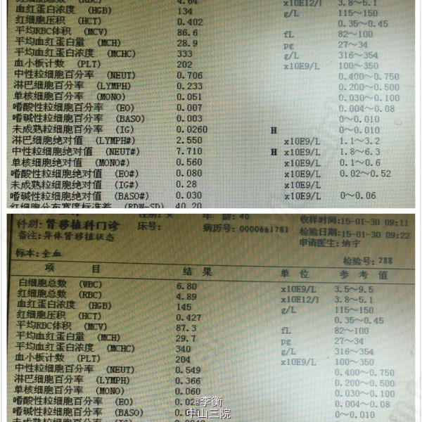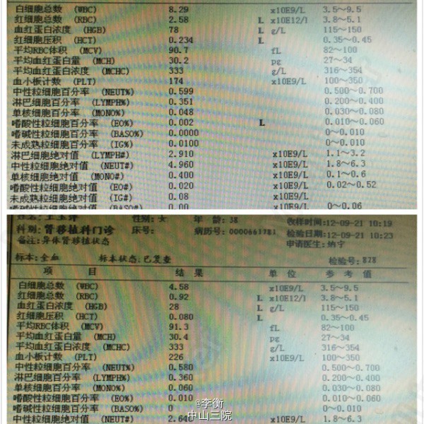 查体:贫血貌,眼睑苍白,甲床苍白,全身未见淤血、淤斑。精神稍差,移植肾区无肿胀,无压痛。 辅助检查 血常规:WBC 9.42*10E9/L,HGB 67g/L,PLT 151*10E9/L 移植肾彩超:移植肾血供良好,血管未见狭窄,移植肾周无积液