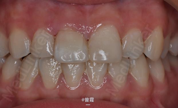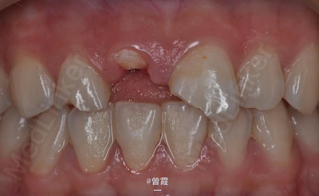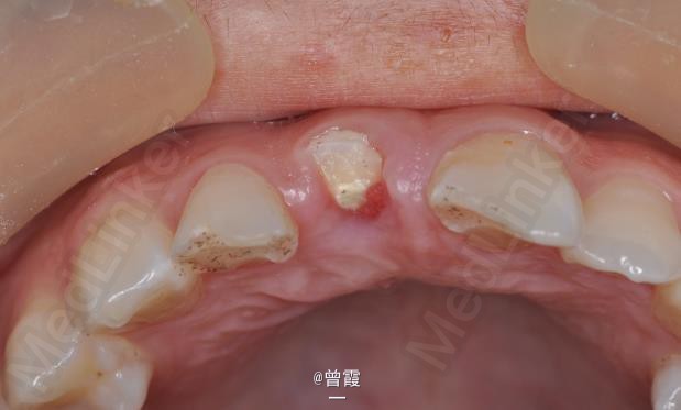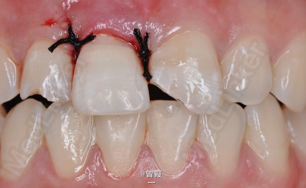 15岁 外伤一月牙齿碎片保留完好曾去多家医疗机构,都表示18岁后才能修复,后转诊我处,翻瓣后劈骨橡皮障下 牙齿碎片断面及粘接界面喷砂处理 粘接,余牙树脂修复。