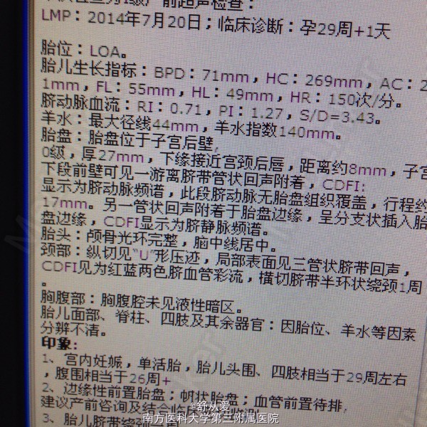 查体:生命体征正常,腹部隆起如孕足月大小,头位,胎心音正常。B超:宫内晚孕,帆状胎盘,血管前置待排。