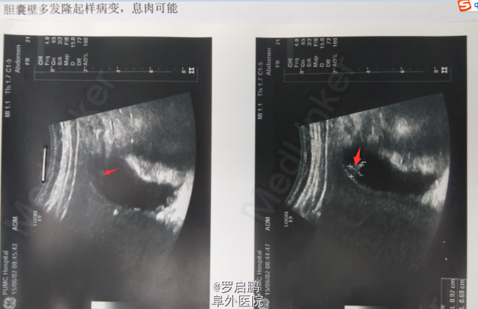 当地医院B超显示息肉约0.6cm; 我院B超显示胆囊壁见多个中等回声突起,较大者0.9*0.7cm。未见明显异动; CDFI未见明显血流信号。提示:胆囊壁多发隆起样病变,息肉可能