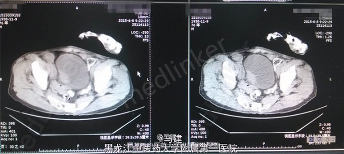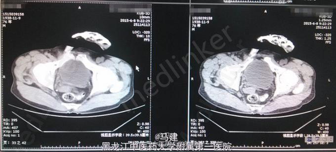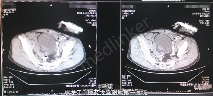 76岁男性患者,因“间断血尿一月余”入院。 现病史:患者一个月前无明显诱因出现肉眼血尿,呈间断性,不伴疼痛,不伴尿频尿急,不伴发热寒战,不伴腹痛腹胀。遂至当地阳新县第三人民医院行彩超检查,示:双肾小结石,膀胱壁异常回声,性质待查。未行特殊治疗。现为求进一步诊治来我院,门诊行膀胱镜检查,示:膀胱新生物,性质待查,并取活检,结果未回。门诊以“膀胱占位”收入我科。患者自起病以来,精神、食欲、睡眠可,小便带血,大便正常,体力体重有轻微下降。 既往史:既往有高血压,具体时间及用药不详,余无特殊。