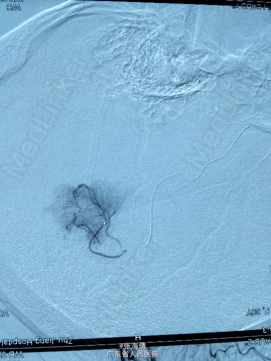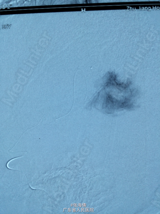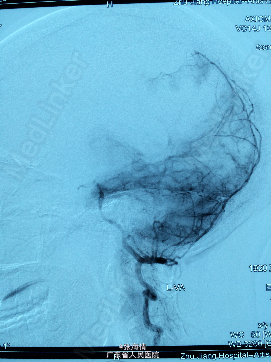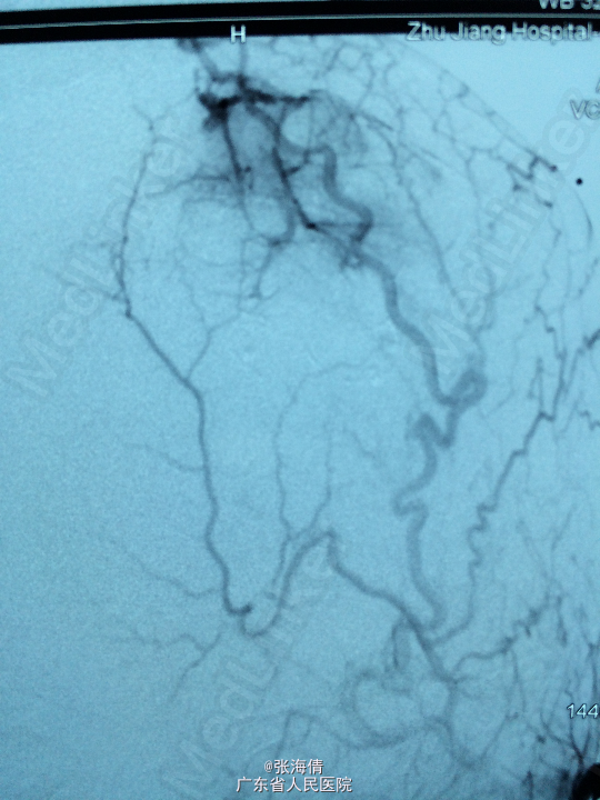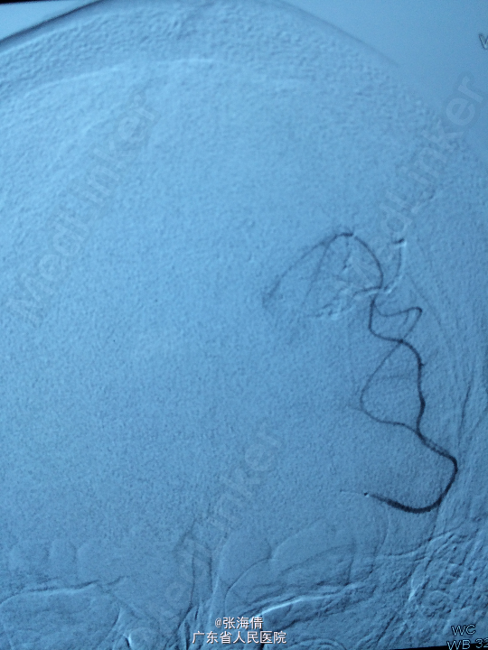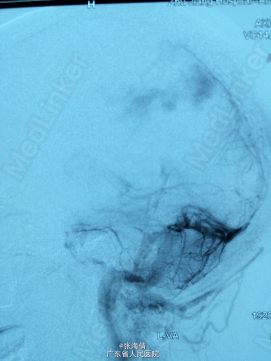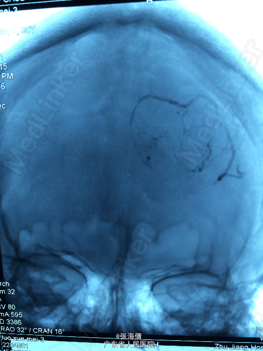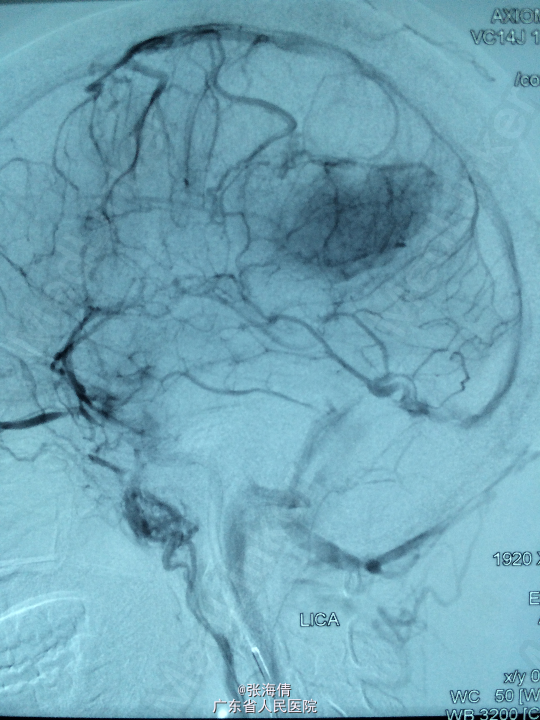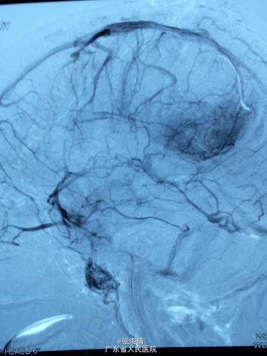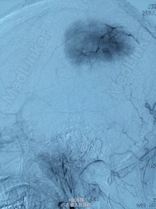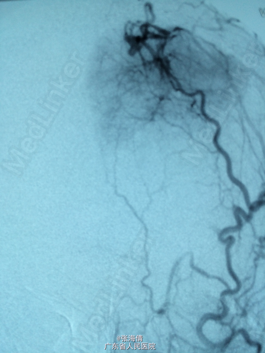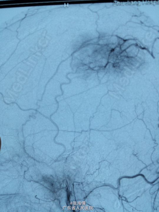 诊断:脑膜瘤 处理:先予DSA以明确肿瘤供血情况,术中脑膜瘤供血丰富,用PVA颗粒超选到供血动脉将其闭塞。后再择期在气管全麻下行脑膜瘤切除术。