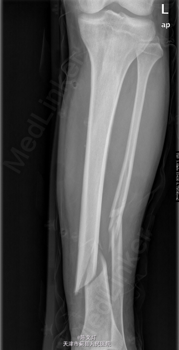 查体:左小腿活动受限,局部疼痛,皮肤感觉无殊,皮肤无破溃,趾端活动无殊,可及足背动脉搏动。其余肢体无殊,病理征未引出。辅助检查:2015-05-06 我院行CR检查提示:左胫腓骨骨折。