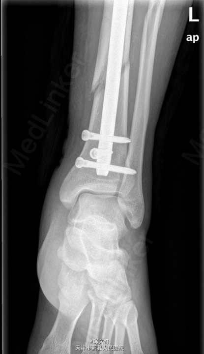 左下肢切口处敷料包扎固定妥,切口对合良好。出院后注意休息,避免左腿负重,避免剧烈活动,防止二次损伤。