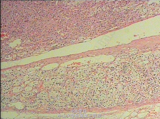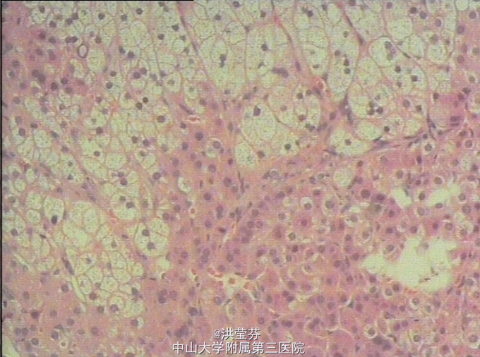 诊断:1、库欣综合征,肾上腺腺瘤(左侧)。2、左心室增大,左心功能不全 予转入泌尿外科行腹腔镜左侧肾上腺肿瘤切除术。术后病理是:(左侧肾上腺)形态结合免疫组化结果,符合(肾上腺)皮质腺瘤。免疫组化结果(③):Vim(+),Syn(+),CgA(-),Ki-67(<3%+),S100(-),CK(-)。