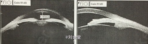右眼视力0.5 眼压11mmHg,滤过泡弥散隆起,2根可调缝线在位,角膜透明,ACD=3.5CT,PACD=1/4CT,房水细胞(+),虹膜周切口通畅,瞳孔约4×4mm,晶体混浊,眼底网膜平伏,眼底C/D=0.9。 左眼无充血,角膜清,中央前房深度5CT、周边1/2CT,瞳孔4×4mm,人工晶体在位,眼底C/D=0.9。 晚期青光眼,慢闭,房角粘闭大于一半就要考虑手术处理