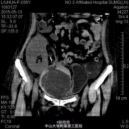 患者右下肢肿胀,移植肾周压痛明显,面色稍苍白。行紧急腹部CT检查提示移植肾下极巨大血肿