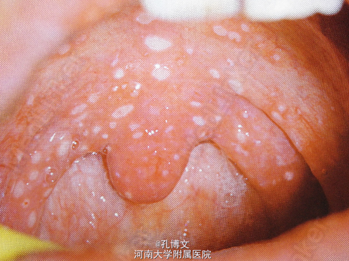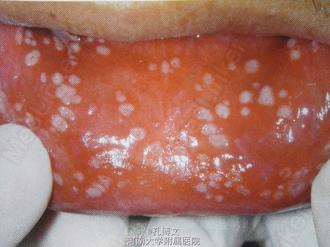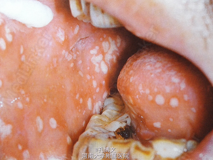 上下唇内侧、舌前份、双颊和软腭黏膜均可见数十个直径2-3mm溃疡,呈满天星样,溃疡均符合“红黄凹痛”特点;舌苔厚腻。