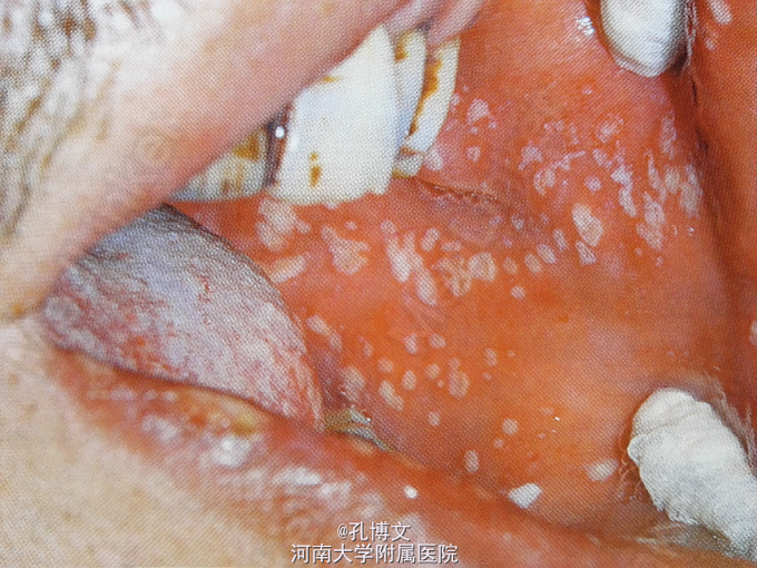 患者男,48岁 主诉:口腔反复溃疡2年,复发5天 病史:2年来患者口腔溃疡反复发作,每次3-6个,间歇期1-2个月。5天前无明显诱因复发,口腔内出现数十个溃疡,疼痛明显。否认眼疾及生殖器溃疡史。否认系统病史和药物过敏史。