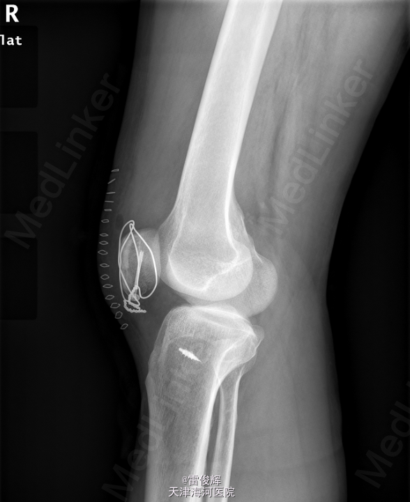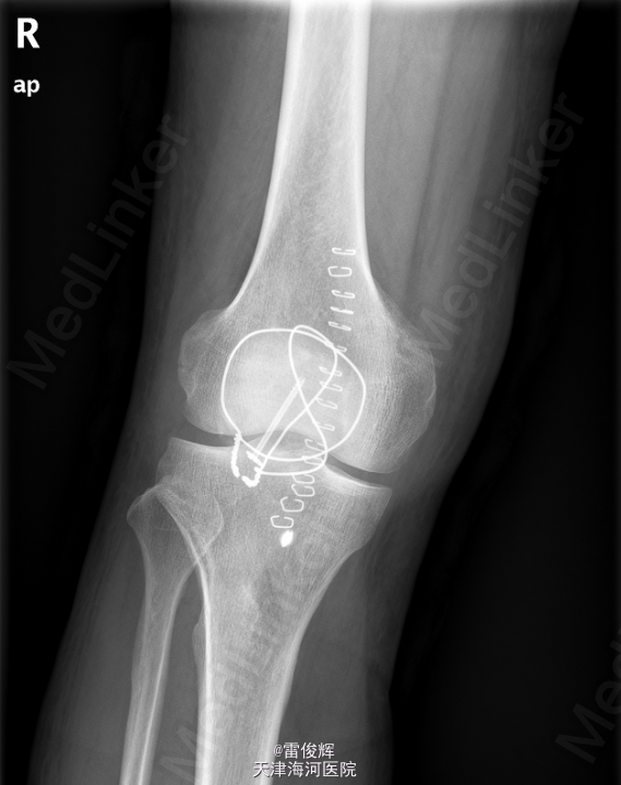 初步诊断: 右髌骨骨折 患者入院后完善检查,排除禁忌,全麻下行右髌骨骨折切开复位内固定+髌韧带修补术。