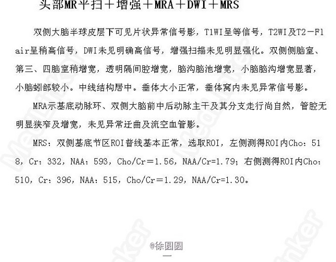 体查:神志清楚,颅神经未见明显异常,四肢肌力、肌张力正常,四肢病理征阴性,四肢共济运动稳准,双侧感觉对称。 辅助检查:头颅MR示双侧大脑半球皮层下可见片状异常信号影,T1WI呈等信号,T2WI及T2-Flair呈稍高信号,DWI未见明确高信号,增强扫描未见明显强化。双侧侧脑室、第三、四脑室稍增宽,透明隔间腔增宽,脑沟脑池增宽,小脑脑沟增宽显著,小脑蚓部较小。中线结构居中。垂体大小正常,垂体窝内未见异常信号影。脑脊液糖2.640mmol/L,氯123.800mmol/L,脑脊液蛋白0.200g/L;白细胞计数14.000x10E6。脑脊液未找到隐球菌、未找到抗酸杆菌。