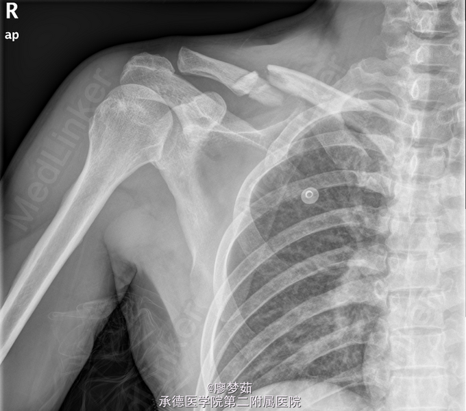 胸廓挤压试验(+),右肩部肿胀,压痛(+). X线片示“右锁骨中外侧段粉碎性骨折。”