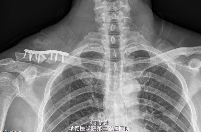 初步诊断: 右侧锁骨粉碎性骨折.全麻下行行“右锁骨骨折切复内固定术”。取右肩部锁骨前外侧切口长约12cm,逐层暴露至骨折端,见锁骨中远段粉碎性骨折,骨折端移位,有一较大碟形骨块,冲洗创面,清除血肿,予复位,予一枚螺钉固定碟形骨块,恢复锁骨长度,放置锁骨远端解剖锁定钢板一块,远近端分别予锁钉螺钉内固定。