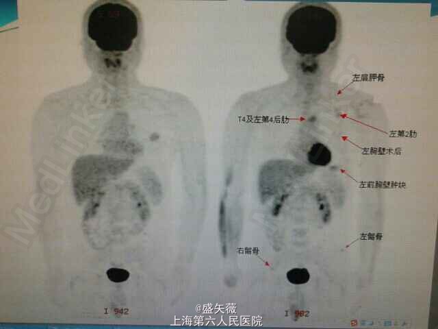 胸腔镜下行左胸壁肿瘤切除+第六肋部分切除术,病理:第六肋间软组织间叶性软骨肉瘤,侵犯骨骼肌。