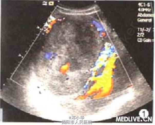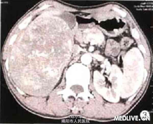 体格检查:体温正常,无消瘦、乏力,皮肤巩膜无黄染,上腹未及肿块,肝肋下3指,脾未扪及。 实验室检查:肿瘤指标正常;乙肝病毒表面抗原(HBsAg)、乙肝病毒e抗体(HBeAb)、乙肝病毒核心抗体(HBcAb)均阳性;。碱性磷酸酶(ALP)521.5 U/L。谷氨酰转肽酶(GGT)180 U/L,丙氨酸氨基转移酶(ALT)85 U/L。 超声检查示右肝内见12.7cm×12.2 cm的实质性肿块(图1)。边界清,无声晕,内部回声强弱不均。低机械指数成像技术下SonoVue超声造影显示动脉期10 s时肿块大部分迅速增强,高于同期肝实质,25 s后大部分消退(图2)。低于同期肝实质,提示恶性病变(肝癌)。 腹部CT示肝增大,右叶一巨大肿块(图3),大小约9.8 cm×13.2 cm。CT提示肝恶性肿瘤,首先考虑肝细胞性肝癌伴淋巴结转移,伴肺部转移,矽肺待排。