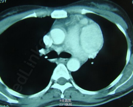 患者女,30岁,因胸闷不适4个月就诊,先后疑诊为肺癌、肺结核等治疗效果欠佳,进入我院。患者发病以来,无发热、咳嗽、血痰、胸痛等。