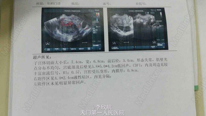 查体:T:36.4度,P:78次/分,R:19次/分,血压:117/75mmhg。神志清楚,查体合作,查体未见阳性体征。 专科情况:外阴:已婚已产式;阴道:畅,分泌物多,脓性;宫颈:肥大;子宫:前位,增大,如男拳大小;附件;右附件可及鸭蛋大小包块,左侧末及异常。 辅助检查:2015年4月本院B超示:子宫7.6*6.6*5.7,宫底部及后壁见5.3*5.2*3.8包块,向浆膜外突起。