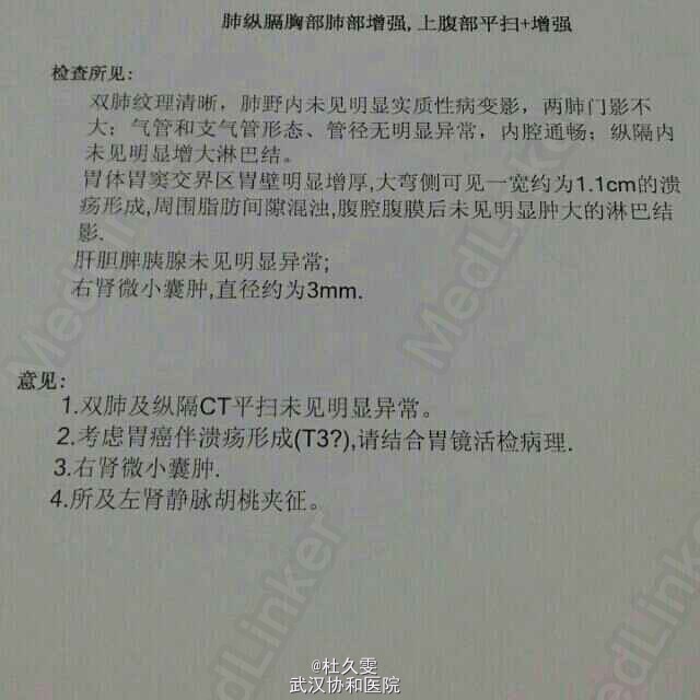 查体:未见明显异常。 辅查:病理报告示:(远端胃)低分化腺癌(部分呈印戒细胞癌形象)侵及胃壁全层。上腹部CT报告:胃体胃窦交界区胃壁明显增厚,大弯侧可见一宽约1.1cm大小溃疡形成,考虑胃癌伴溃疡形成(T3?)。肿瘤标志物未见异常。详见下图。