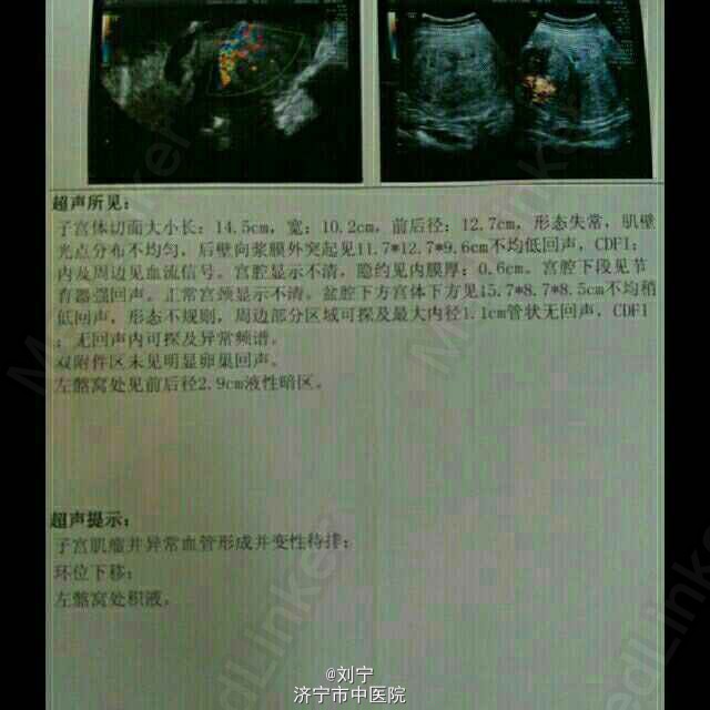 查体:外阴:经产式;阴道:畅;宫颈:原形态消失,突出,质硬;宫体:小儿头大,质硬,活动度差;附件:难以触及。 妇科B超:子宫肌瘤并异常血管形成并变性待排,环位下移,左髂窝积液。