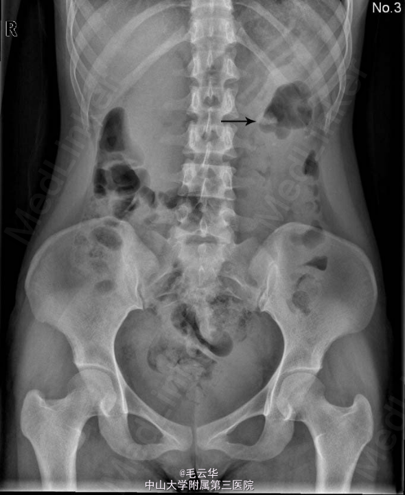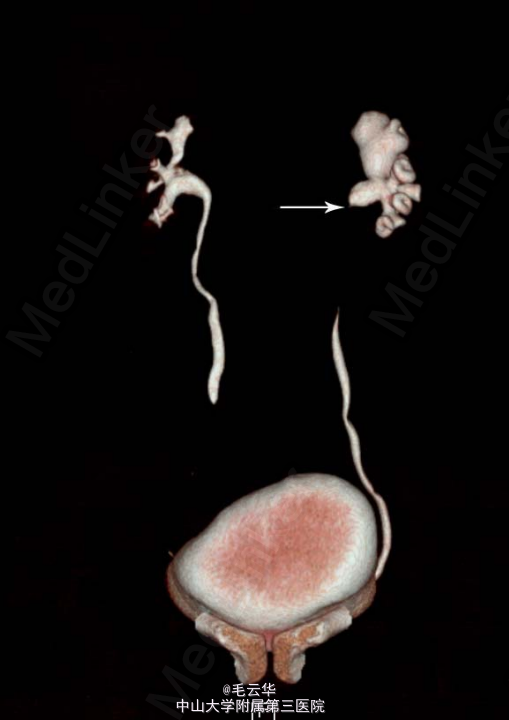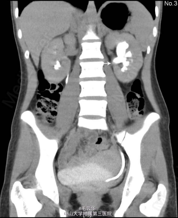 患者女,21岁,左腰痛1年余,加重3天 患者1年余前左腰隐痛不适,无腹痛、恶心、呕吐,无发热,无尿频、尿急、尿痛,无肉眼血尿,无排尿困难,未予重视。3天前左腰痛突然加重,阵发性绞痛,伴下腹及腹股沟疼痛, 伴恶心、呕吐,无发热,无尿频、尿急、血尿、排尿困难,当地医院查B超发现左肾结石,现为进一步治疗入住我科。