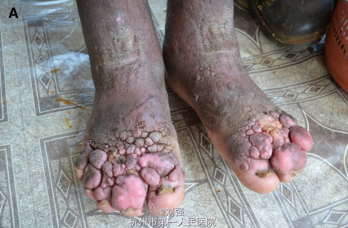 患者24岁埃塞俄比亚西北部男性,因“双足进行性水肿8年” 入院,伴有苔藓样的乳突瘤和硬结节形成,角化过度,现在患者有瘙痒以及火烧感。有长期光脚接触碱性粘土的习惯,无疫水接触史以及寄生虫感染病史,余病史无特殊。