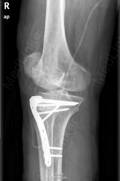 初步诊断:右胫骨平台粉碎性骨折.全麻下行行“右胫骨平台骨折切开复位内固定术+人工骨植骨术”。