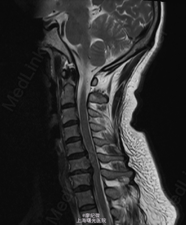 脊柱生理曲度存在,颈项部无明显压痛,颈椎活动无明显受限,全身深浅感觉均存在,左肱三头肌肌力5-级,左食指、中指感觉减退,余无殊.霍夫曼征阴性,膝腱反射无亢进,双侧直腿抬高实验阴性,双侧巴氏征阴性。 当地医院MR:颈6/7椎间盘脱出伴相应椎管狭窄.