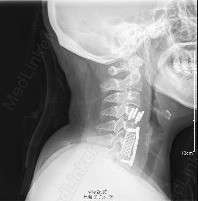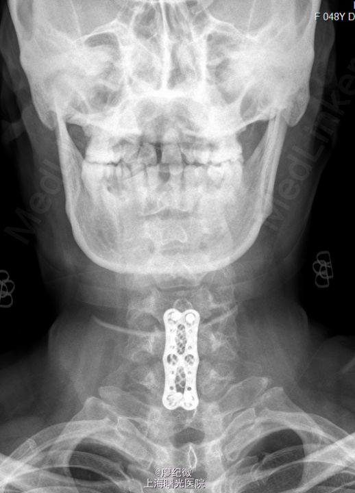 初步诊断:颈椎病. 处理: 全麻麻醉下行“[颈椎]颈椎前路减压融合内固定术”. 作右颈前上斜切口长约6cm,逐层切开皮肤、皮下组织、颈阔肌,自胸锁乳突肌内侧钝性分离,分离直达颈椎前方。经C形臂影像增强器透视确定C6椎体,剥离椎前筋膜和前纵韧带,显露椎体前方,于C7、C5椎体上各置入撑开螺钉1枚,撑开器适当撑开,彻底清除C5/6、C6/7椎间盘,减压彻底后,予以冲洗。取合适大小钛网植入,前方放置一块钢板,C7、C5椎体各攻入两枚螺钉,并予以自锁。经C形臂影像增强器透视位置理想,螺钉长度合适。