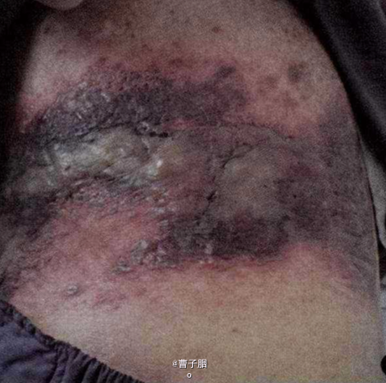 泛发性带状疱疹是重型带状疱疹,表现为在带状疱疹的基础上全身泛发水疱。严重者出现皮肤坏死及血疱,威胁患者生命。本例患者移植后长期服用免疫抑制药,是带状疱疹泛发全身的主要原因。
