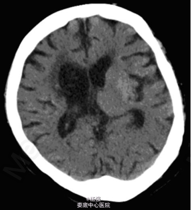 入院查体:血压120/70mmHg ,心肺腹(-),神清,言语不清,面部挤眉弄眼、撅嘴,右侧肢体不自主舞蹈样动作,肌力正常,肌张力稍高,右侧深浅感觉无明显异常,左侧肢体肌力 2-级,肌张力增高,左侧偏身痛觉障碍,左巴氏征(+),脑膜刺激征(-)。 入院后测静脉血糖 38畅28mmol/L;尿常规:糖(+++)酮体(-)。头颅 CT 提示左侧纹状体稍高密度灶,无占位效应,左侧小脑半球及右侧基底节区软化灶。
