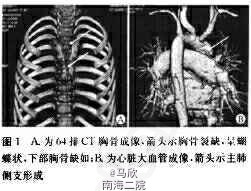 查体:口唇青紫明显,胸骨上部为软骨,下部呈“V”形。剑突缺如。心尖搏动位于左胸骨中线内侧,胸骨左缘第2~4肋间闻及3/6级收缩期杂音。腹中线脐上有一2crn*3crn缺损愈合瘢痕,杵状指趾明显。心电图示:右室肥厚,右房扩大。64排CT示:法乐四联症,主动脉弓无异常。弓降部与左肺动脉间有一异常侧枝血管,胸骨裂,下部胸骨缺如。