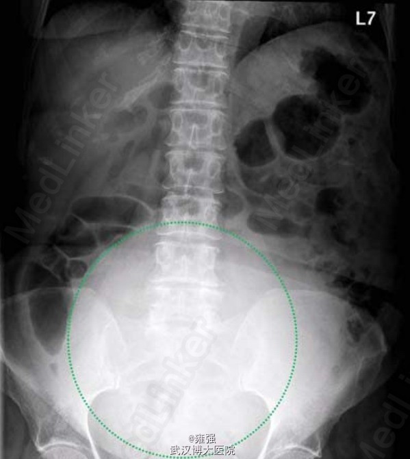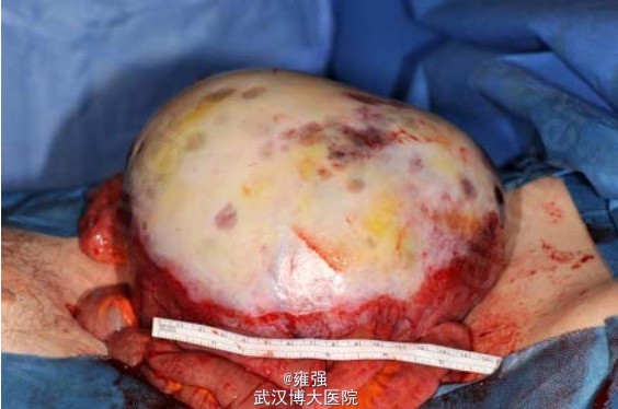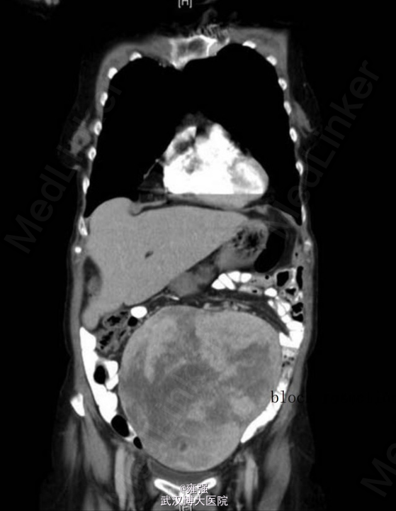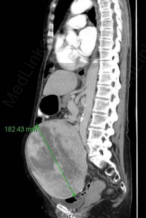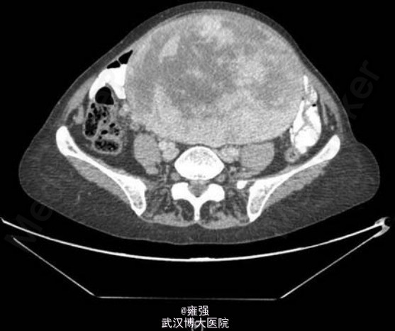 辅检:肿瘤标记物(CEA、CA19-9、CA125)均在正常范围,入院后腹部X片示下腹部出现增强的不透光区(如下图示)。术前TAP分段CT示盆腔内大型、界限清楚、中线测量为 18.8 cm×13.3 cm×18.2 cm、混合衰减的包块(如下图示),位于子宫前、膀胱之上,独立于子宫存在,考虑为起源于卵巢。