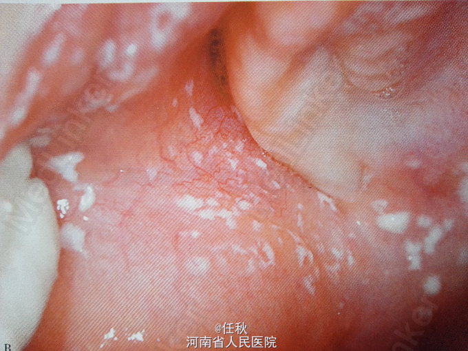 上下唇内侧、舌背、双颊及腭部黏膜均见广泛片状的白色假膜,用力可拭去,拭去后见黏膜轻微充血。