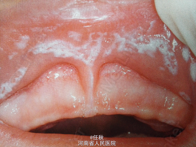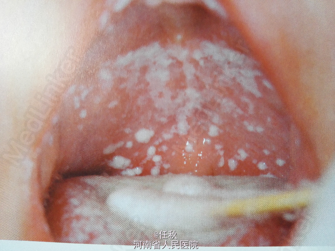 患者男,3个月 主诉:口腔白色斑片4天 病史:4天前家属发现患儿口内较多白色斑片,未发现患儿有明显不适感,无明显哭闹。3天前曾发热,经治疗(具体治疗不详)后已退热。否认系统病史及药物过敏史。