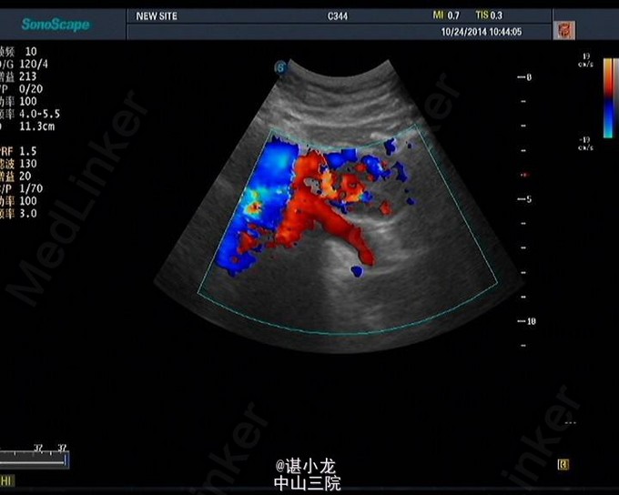 患者为中年女性,半年前无明显诱因偶尔出现上腹部胀痛,无向背后放射,疼痛与饮食无关,无伴恶心、呕吐。2个月前就诊于湛江市人民医院,查超声提示腹膜后存在一大小约4cm肿物,于2014-9-10局麻下行TACE术,术后恢复可。为行进一步治疗来我院就诊。精神睡眠可,饮食可,二便正常。近期体重无明显改变。