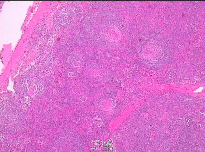 巨淋巴结增生是一种罕见的良性淋巴节增生性疾病,可发生于任何年龄,甚至可发于婴幼儿,成年人发病多见,最常见单发型CD ,多发型则相对少见。本病的起源是由于免疫调节缺陷导致的淋巴结中B淋巴细胞及浆细胞的过度增生,免疫学的研究证实CD发病可能与病毒感染有关。CD病理学分为三个主要类型:1)透明血管型2)浆细胞型3)混合型。90%的单中心型CD是透明血管型 ,表现为病变淋巴结滤泡增生和滤泡间小血管增生及透明性变,部分小淋巴细胞围绕生发中心呈环层状排列(似洋葱皮样结构)。手术切除目前为止被认为是单中心型CD的最合适治疗方法,部分无法切除患者可选择放化疗等方法。手术治疗方面,由于CD多有丰富的血供且周围解剖结构复杂,多紧邻血管神经,因此CD的手术治疗需要做好充足的术前准备。术前全面的影像学检查、充分备血对于手术治疗CD十分必要。化放疗方面,无统一的化疗方案,部分化疗方案如CHOP化疗方案等取得了良好的效果,采取放疗的方式治疗无法手术切除的单中心型CD也取得了良好的效果。