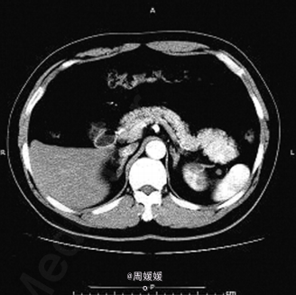 查体未见明显异常. 实验室检查:实验室检查 :肿瘤标志物甲胎蛋白 6.57ng/mL ,癌胚抗原3.64ng/mL ,糖类抗原1259U/mL ,糖链抗原19-9 12.30U/mL ,鳞状细胞癌相关抗原0.8ng/mL 。 B超提示:胰尾部可见一大小3.5cm*2.8cm 低回声区 ,边界尚清 ,内部回声不均。胰管不扩张。 增强CT提示:胰腺尾部可见一肿块影 ,大小约4.4cm*3.4cm*2.4 cm,动脉期、静脉期明显强化