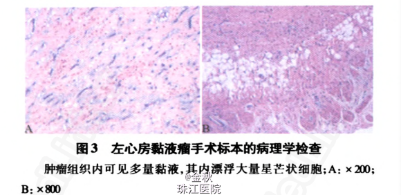 诊断——左心房粘液瘤并多发性脑梗死。 处理——人院后予阿司匹林抗血小板,低分子肝素钙抗凝以及活血等治疗。确诊后,患者在人院第4天转心胸外科行心脏肿瘤切除术,术中见肿瘤位于左心房,大小约30mmX 40mmX 40mm,有一窄蒂连于房间隔,完整摘除左心房肿瘤。术后病理学检查:心脏黏液瘤(图3),肿瘤大小25mmX20mmX12mm。术后第6天复查超声心动图:二尖瓣轻度返流,少量心包积液(图2B)。