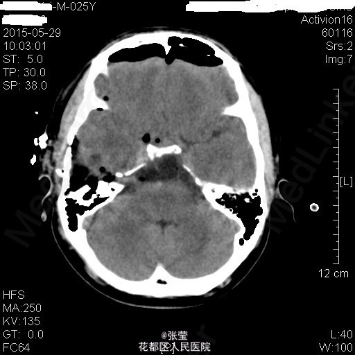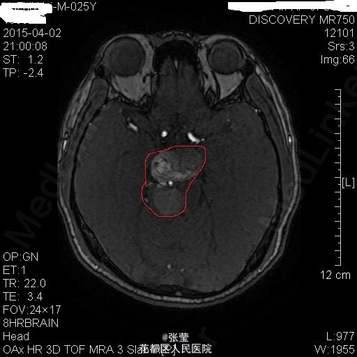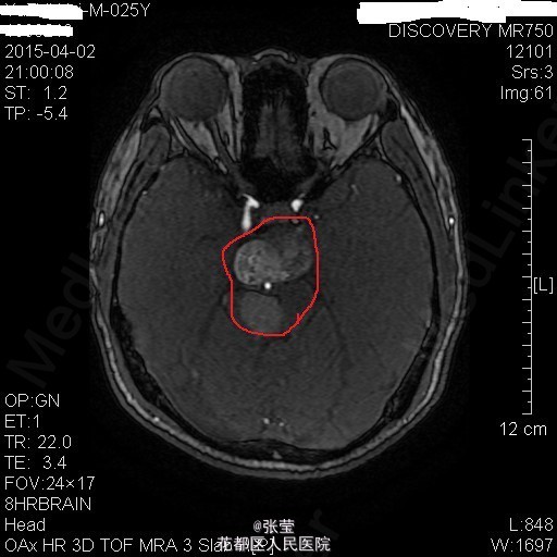 查体:神清,对答切题,双瞳等大等圆,直径约3mm,对光反射灵敏,双侧听力粗测正常,四肢肌力Ⅴ级。生理反射存在,病理征未引出。 辅查:颅脑MR:1、斜坡区占位,侵及中脑、脑桥右份及蝶窦,病灶ADC值增高,FA值下降,考虑脊索瘤并囊变、出血可能大。 2、MRA示双侧颈内动脉向外侧移位,余脑动脉未见明确异常。