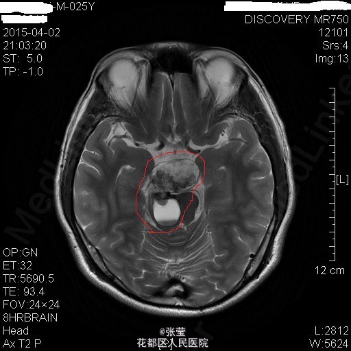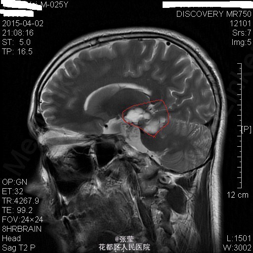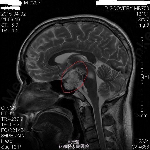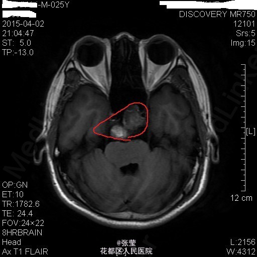 青年男性,主诉:头晕伴肢体乏力1周。 现病史:患者1周前始无明显诱因反复出现头晕,伴左侧肢体乏力、行走不稳,偶伴头痛、恶心感,休息后可稍缓解,无呕吐,无天旋地转感,无晕厥,无伴听力、记忆力减退等,发作无明显规律。至当地医院就诊,头部MR结果示:右间脑下方-脑干-桥前池-左鞍底区肿瘤,并瘤内卒中。