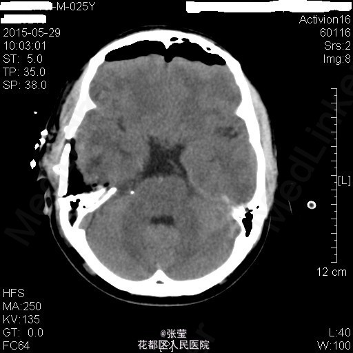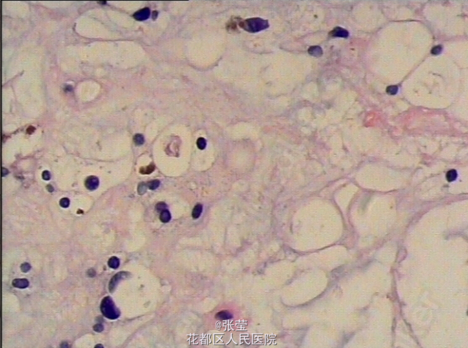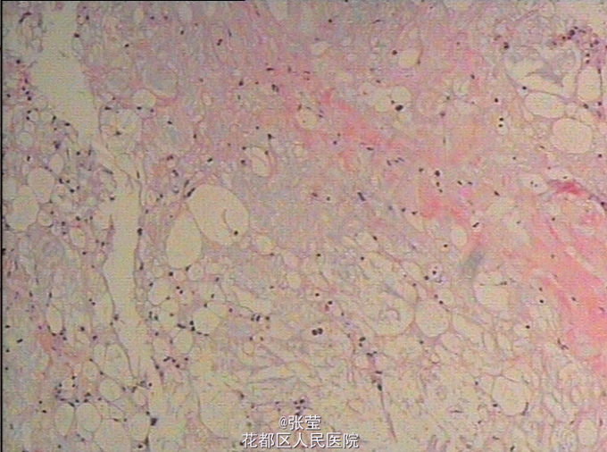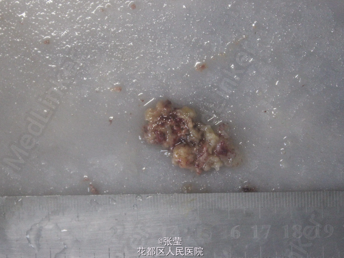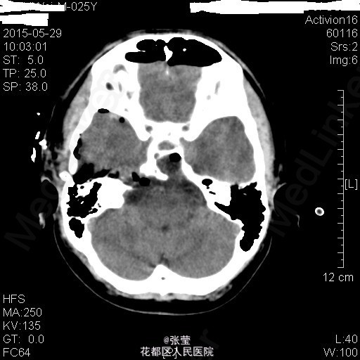 患者入院后完善相关检查,排除手术禁忌症,于2015年4月7日行"神经内镜下经鼻蝶入路斜坡脑干占位病变切除+鞍底重建+左下腹脂肪取出术",手术顺利。 术后病理示:脊索瘤。 予抗感染、护胃、化痰、维持水电解质平衡及加强营养支持治疗,患者病情较前明显好转。