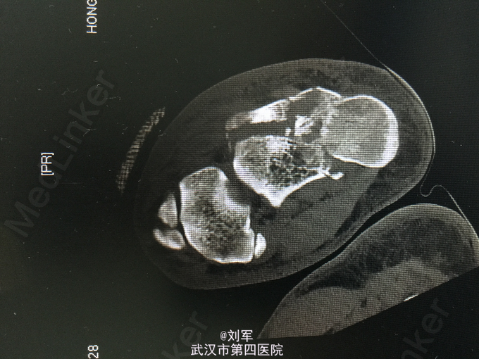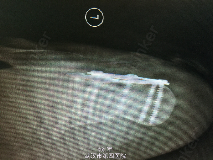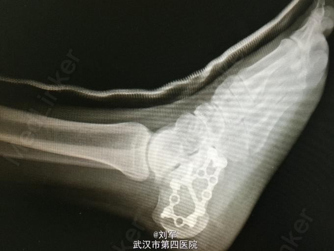 左跟骨粉碎性骨折。 入院后完善检查,入院后第六天行开放复位内固定术。