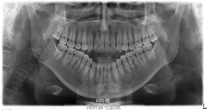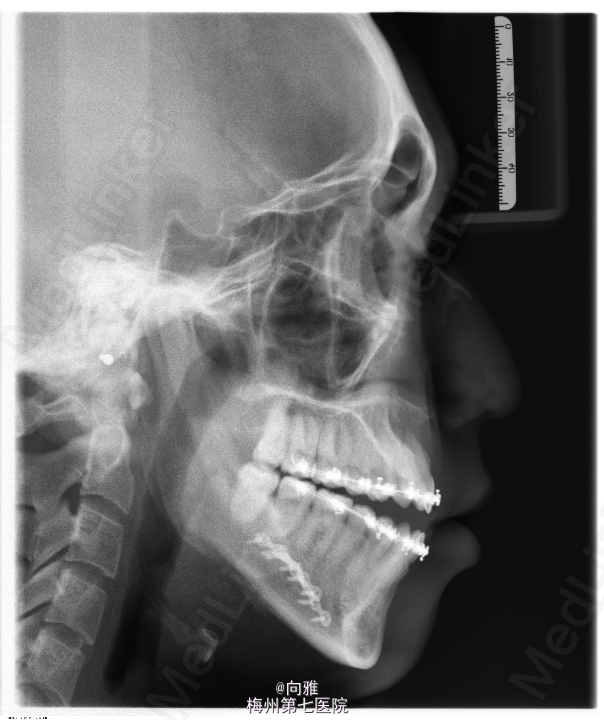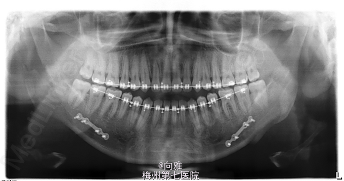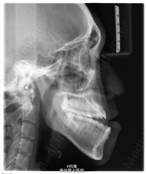 双侧颌面部基本对称,侧面观:面下1/3前突。左侧颞下颌关节触及弹响,右侧颞下颌关节未触及弹响,双侧颞下颌关节无压痛。开口型“↓”,开口度3.5cm。口内全口牙列正畸托槽,前牙开合、反合,约2cm,双侧后牙I类关系。